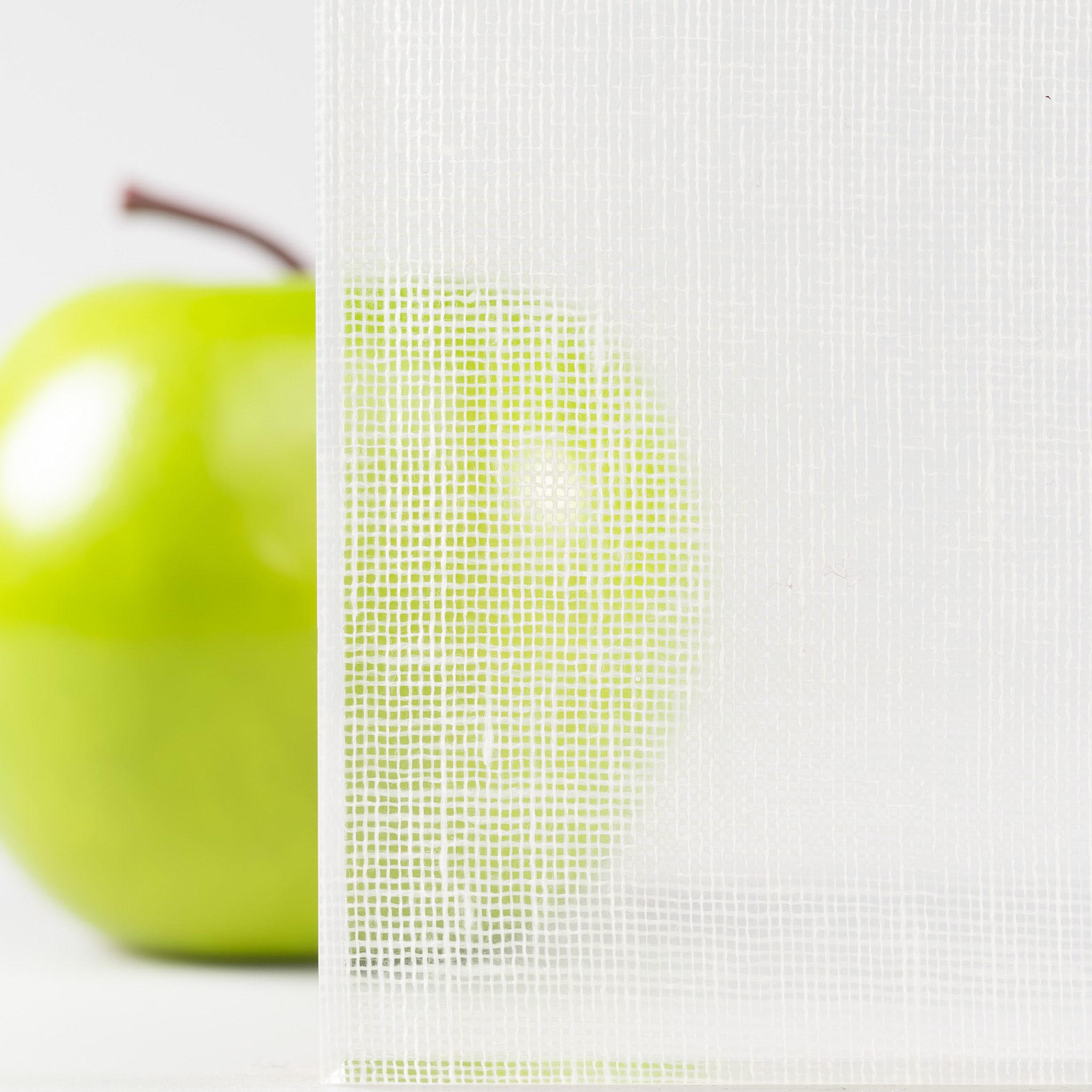 Square-patterned glass with a white wispy gauze-like transparent polyester interlayer to provide muted light transmittance and medium opacity. A double-sided solution, this product is ideal for white partition walls and doors.