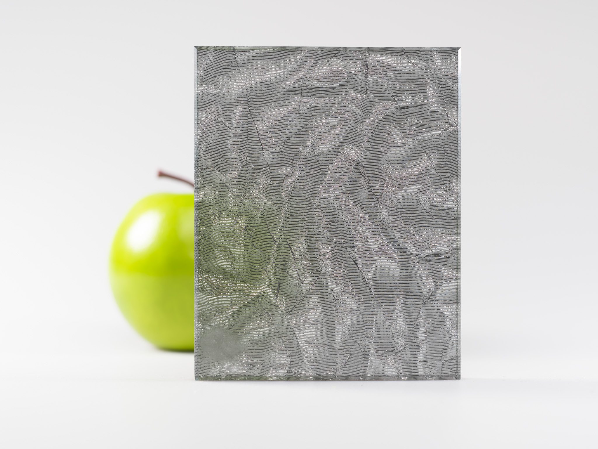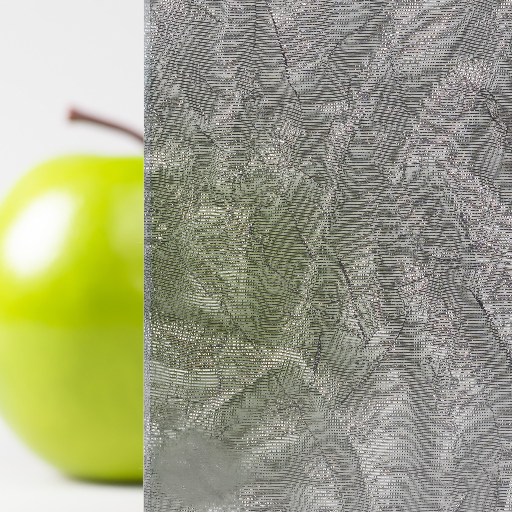 Fabric and metal help the wrinkled pattern in this frosted grey float glass come to life, as does medium translucency that allows for subtle but perceptible light permeation.