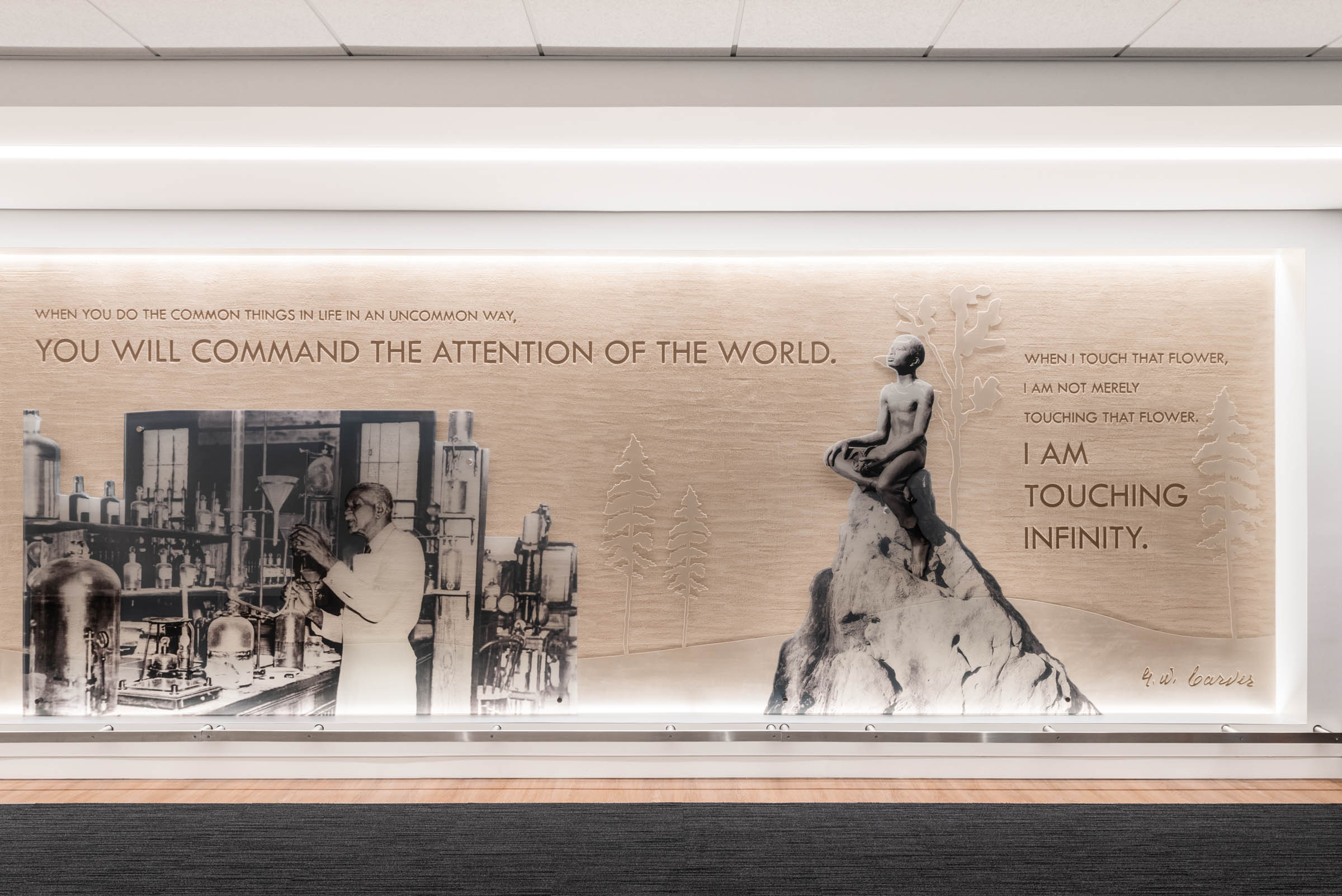 Archetype worked through several rounds of development in creating the photographic silhouettes for this floor-to-ceiling installation, resulting in a compelling storyline mural that highlights the lasting contributions of George Washington Carver’s work in the field of agricultural research.