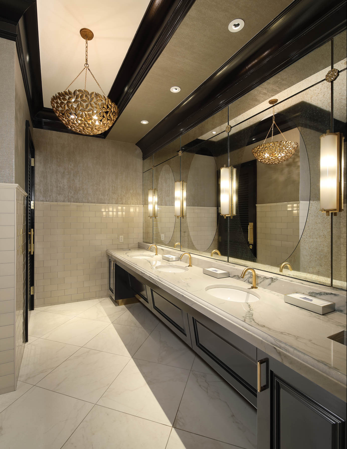 The mirrors in the luxuriously appointed lounges consist of circular vanity mirrors surrounded by antique mirror, and were made using our Selective Silvers™ process, which allows for multiple mirrored finishes to be fabricated as one panel, achieving a distinctive old-world presence with the added benefits of simplified installation and easy maintenance.